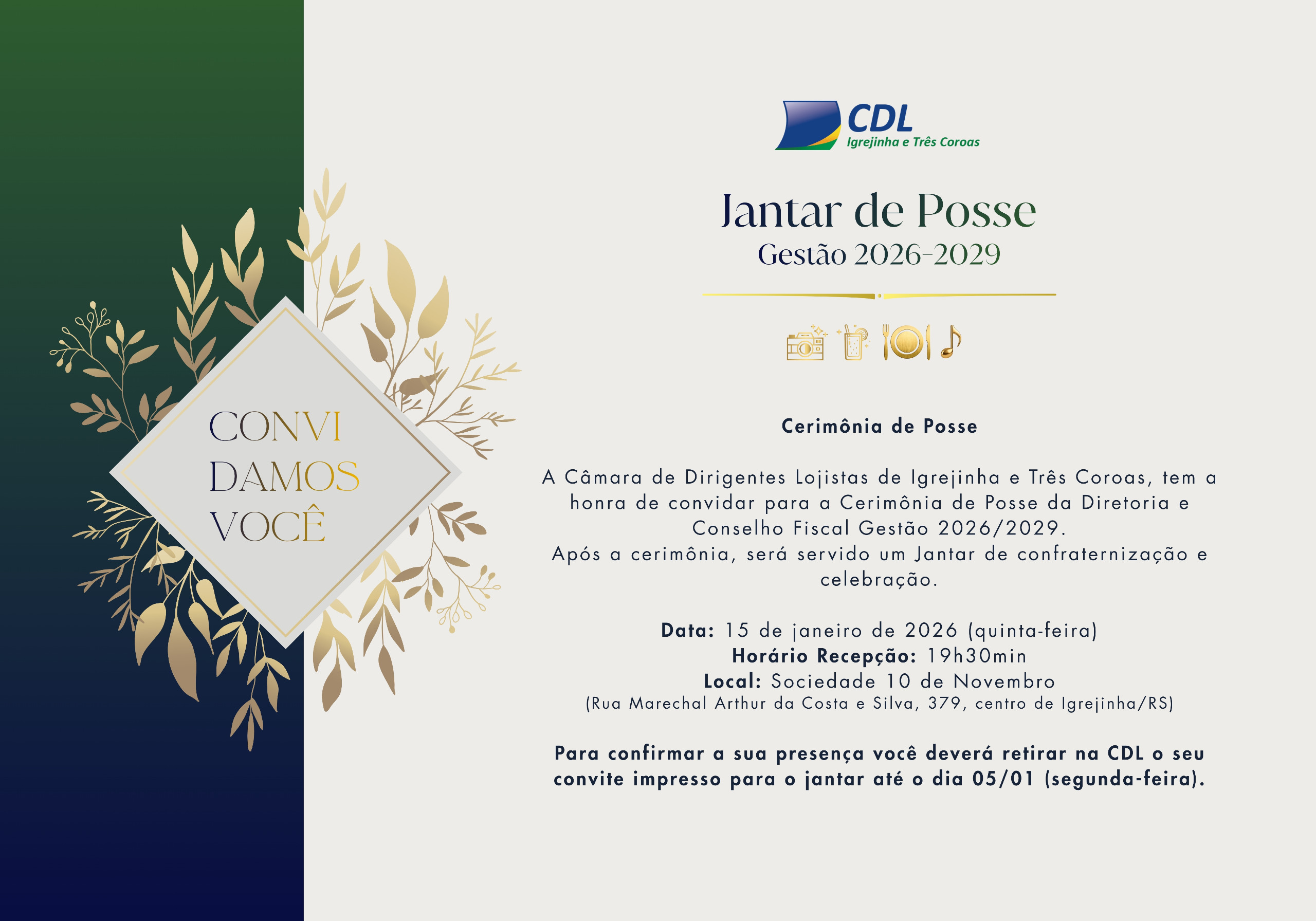 Prezado Associado, Você é nosso convidado especial para participar do Jantar de Posse da Diretoria e Conselho Fiscal da CDL Gestão 2026/2029, você terá direito a 1(um) […]